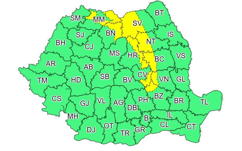 3 din 3 | Judeţele vizate de atenţionarea Cod galben sunt: Bacău, Bistriţa-Năsăud, Buzău, Covasna, Harghita, Maramureş, Neamţ, Suceava şi Vrancea.