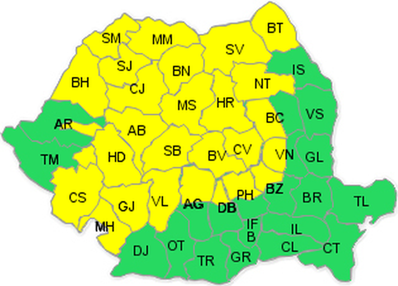 Meteorologii au emis, sambata, o atentionare de cod galben de ploi, descarcari electrice si vijelii, pentru mai multe judete din nordul, vestul si centrul tarii, valabila de duminica de la ora 14, pana luni la ora 6 dimineata.