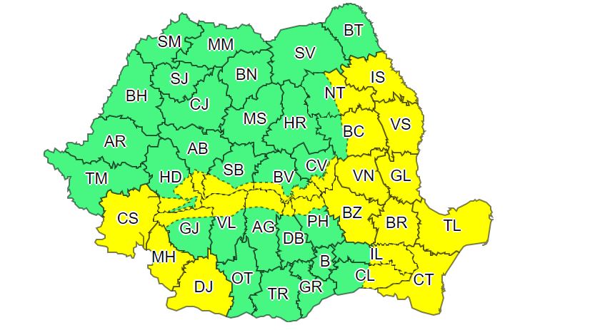 Potrivit ANM, sunt județele vizate de codul galben sunt: Cluj, Bihor, Alba, Arad, Hunedoara, Timiș, Caraș-Severin, Mehedinți, Gorj, Sibiu, Vâlcea, Brașov, Argeș, Dâmbovița, Prahova, Călărași, Ialomița, Constanța, Tulcea, Brăila, Galați, Buzău, Covasna, Vrancea, Harghita, Vaslui, Bacău, Iași, Neamț, Mureș, Suceava, Bistrița-Năsăud, Maramureș și Satu Mare.