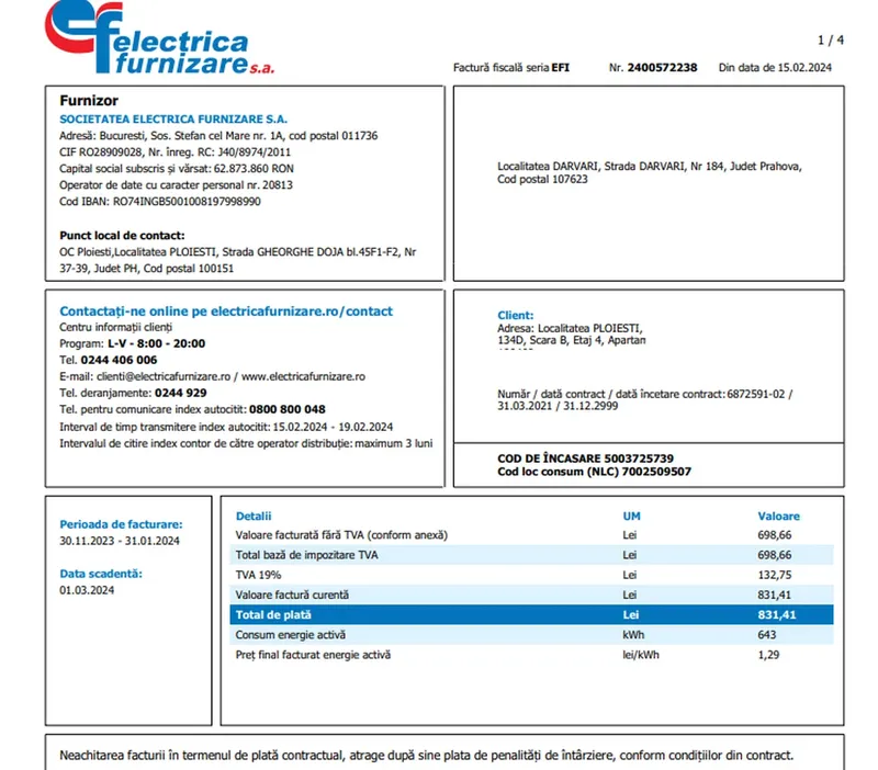 În data de 15.02.2024, a fost emisă factura de tip estimare nr. 2400572238, în valoare de 831,41 lei, pentru perioada 30.11.2023-31.01.2024, de la index estimat 30270 până la index estimat 30913.