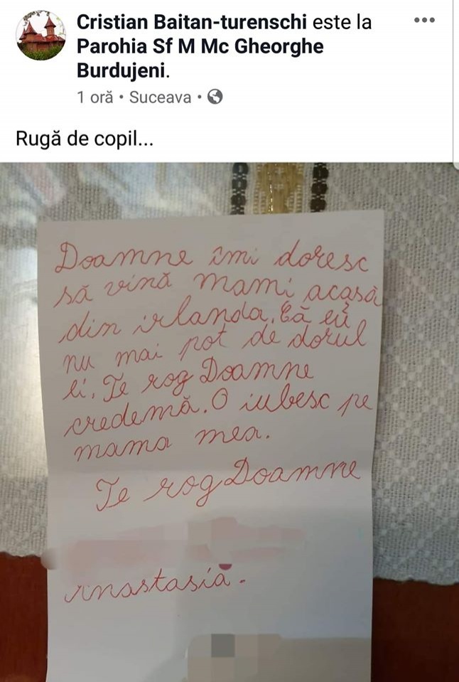 „Doamne, îmi doresc să vină mami acasă din Irlanda. Că eu nu mai pot de dorul ei. Te rog, Doamne, crede-mă. O iubesc pe mama mea. Te rog, Doamne. Anastasia”.