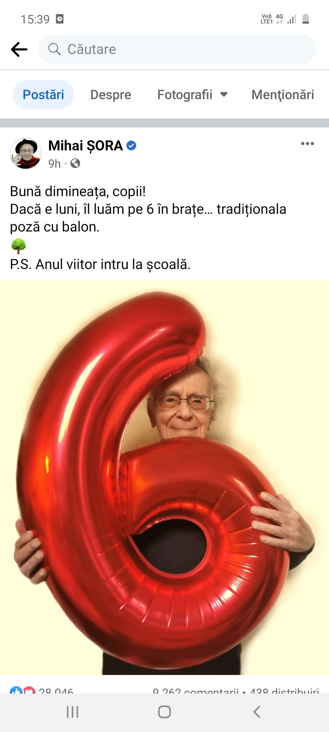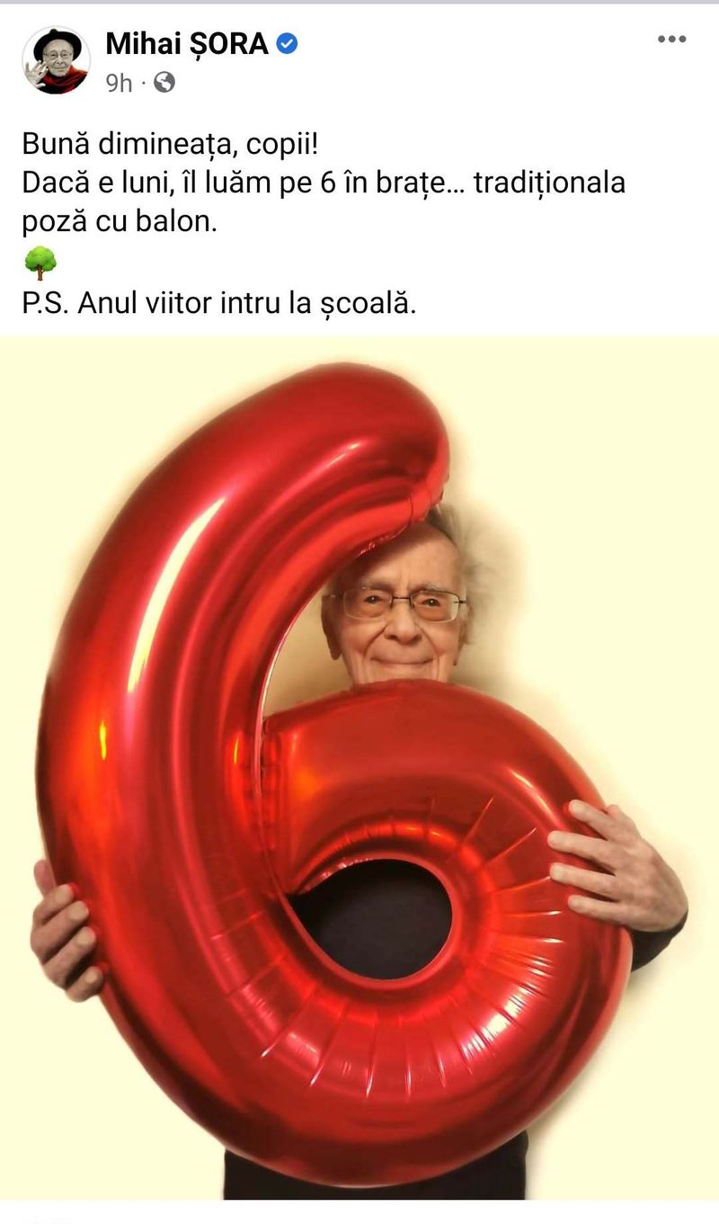 „Bună dimineața, copii! Dacă e luni, îl luăm pe 6 în brațe… tradiționala poză cu balon”, a scris Șora pe Facebook.