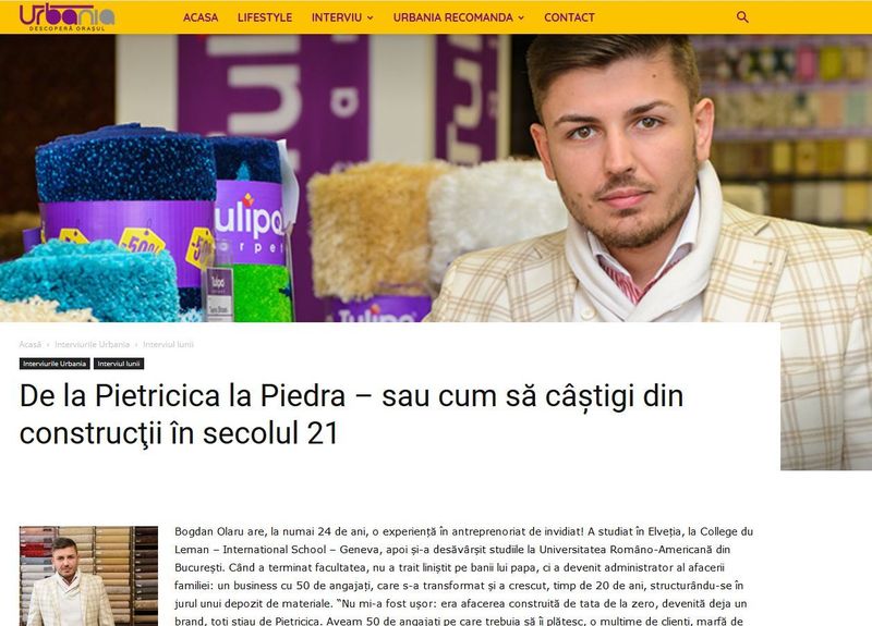 „Bogdan Olaru are, la numai 24 de ani, o experienta in antreprenoriat de invidiat! A studiat in Elvetia, la College du Leman – International School – Geneva, apoi si-a desavarsit studiile la Universitatea Romano-Americana din Bucuresti. Cand a terminat facultatea, nu a trait linistit pe banii lui papa, ci a devenit administrator al afacerii familiei: un business cu 50 de angajati, care s-a transformat si a crescut timp de 20 de ani, structurandu-se in jurul unui depozit de materiale.