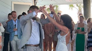 Acela a fost momentul fatidic în care o șoferiță băută de 25 de ani, care se afla la volanul unei mașini Toyota închiriate, a intrat cu viteză în vehiculul de golf care îi transporta pe miri.