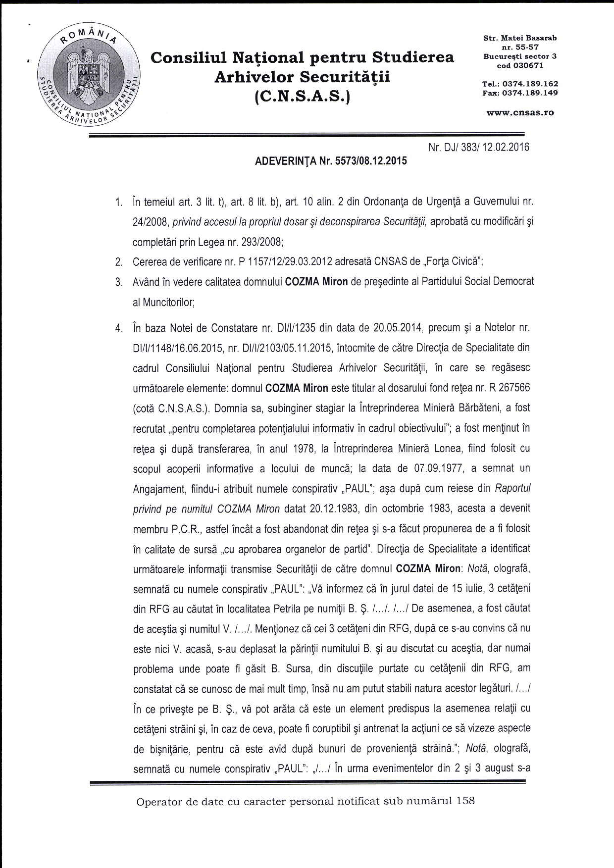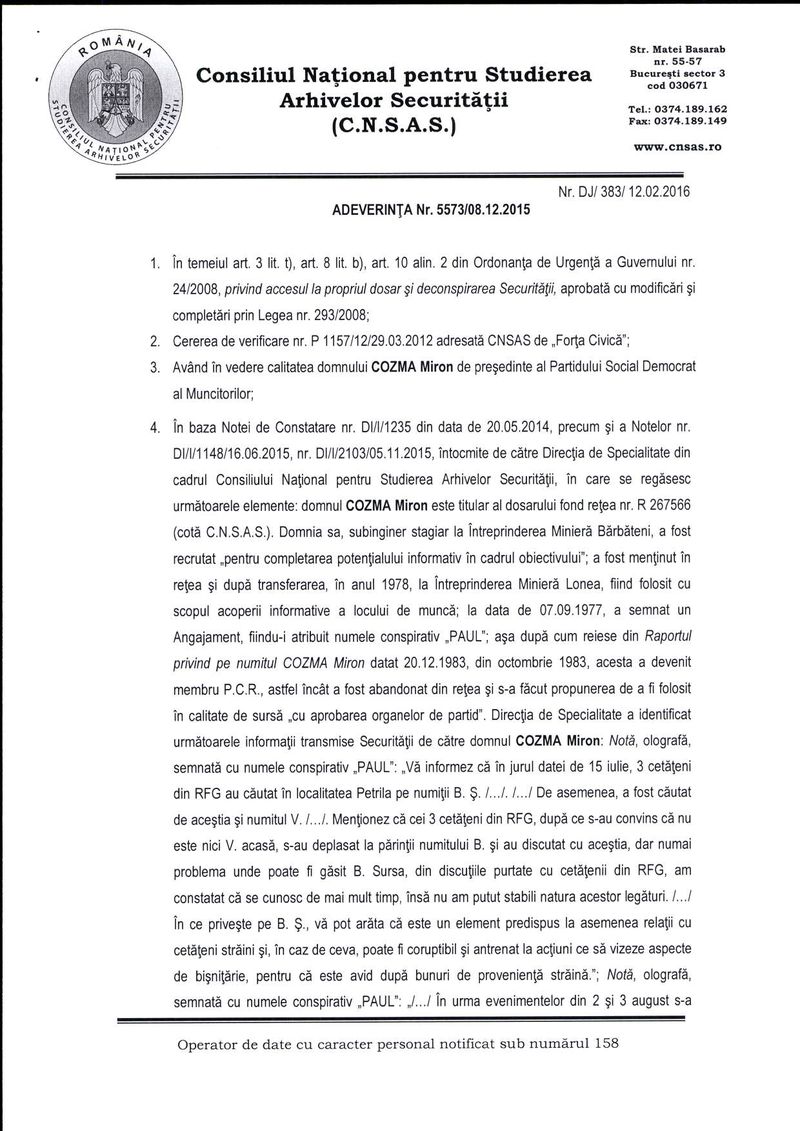 Toate bune si frumoase, doar ca... lipseste ceva. Ce nu s-a spus de la bun inceput este un fapt clar si concret: "Dosarul Cozma" a fost studiat inca de anul trecut de specialistii CNSAS care au concluzionat fara echivoc intr-o adeverinta publicata pe site-ul institutiei inca din 8.12.2015