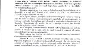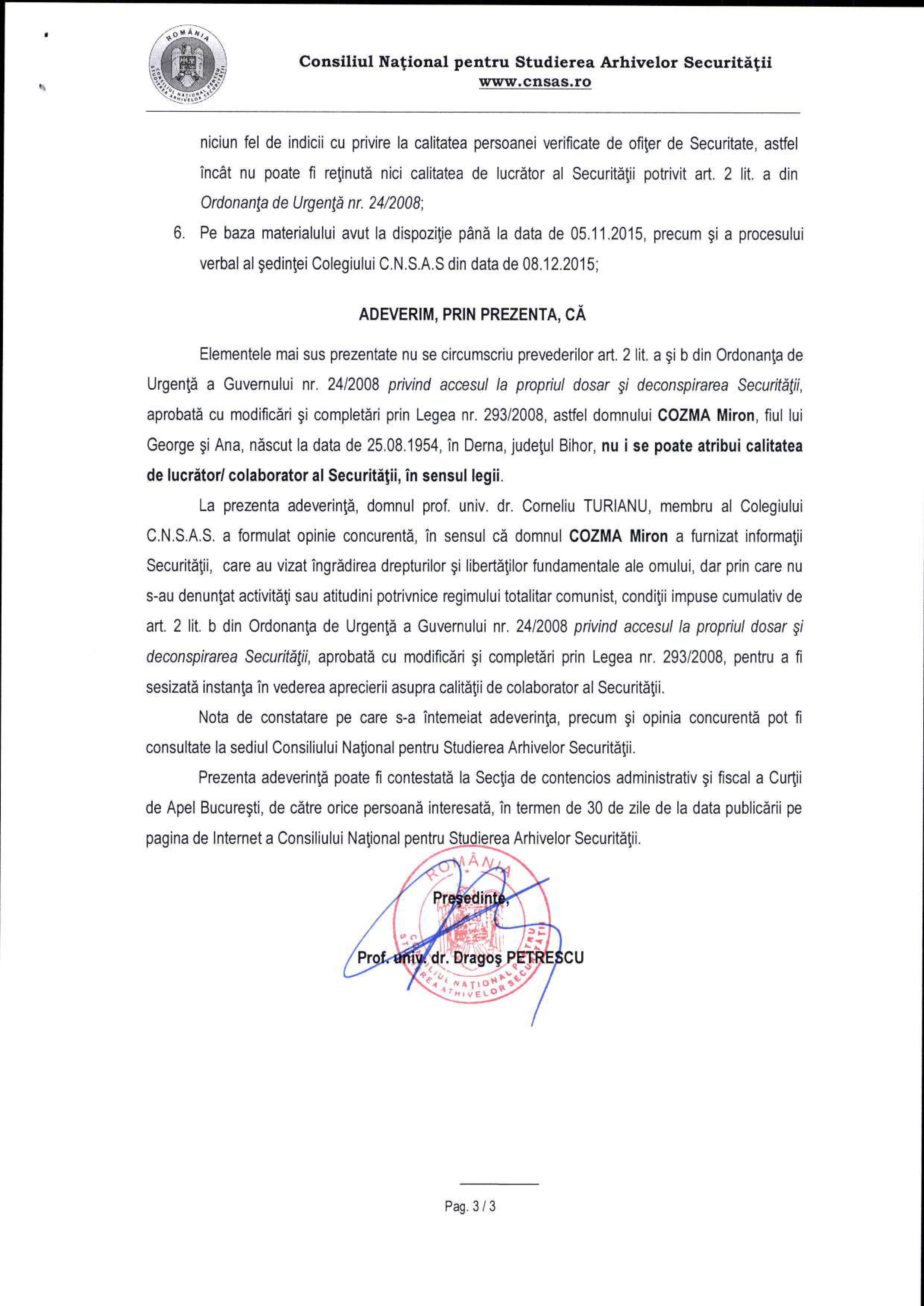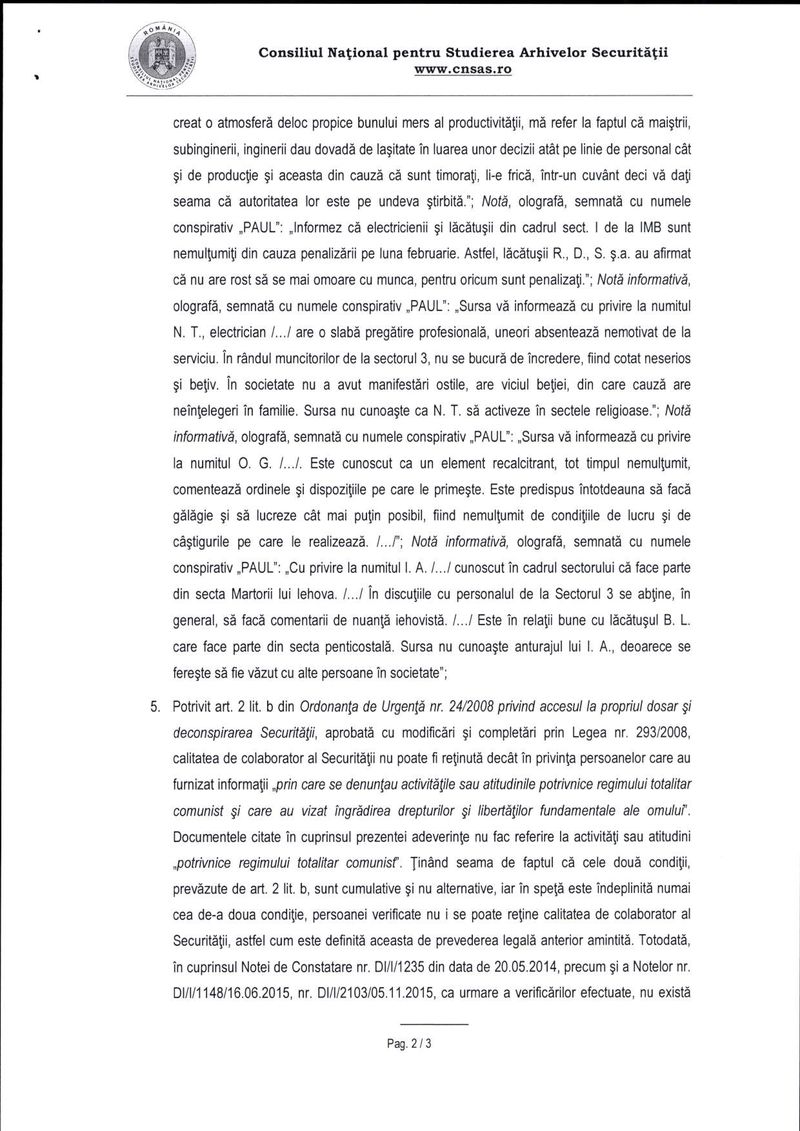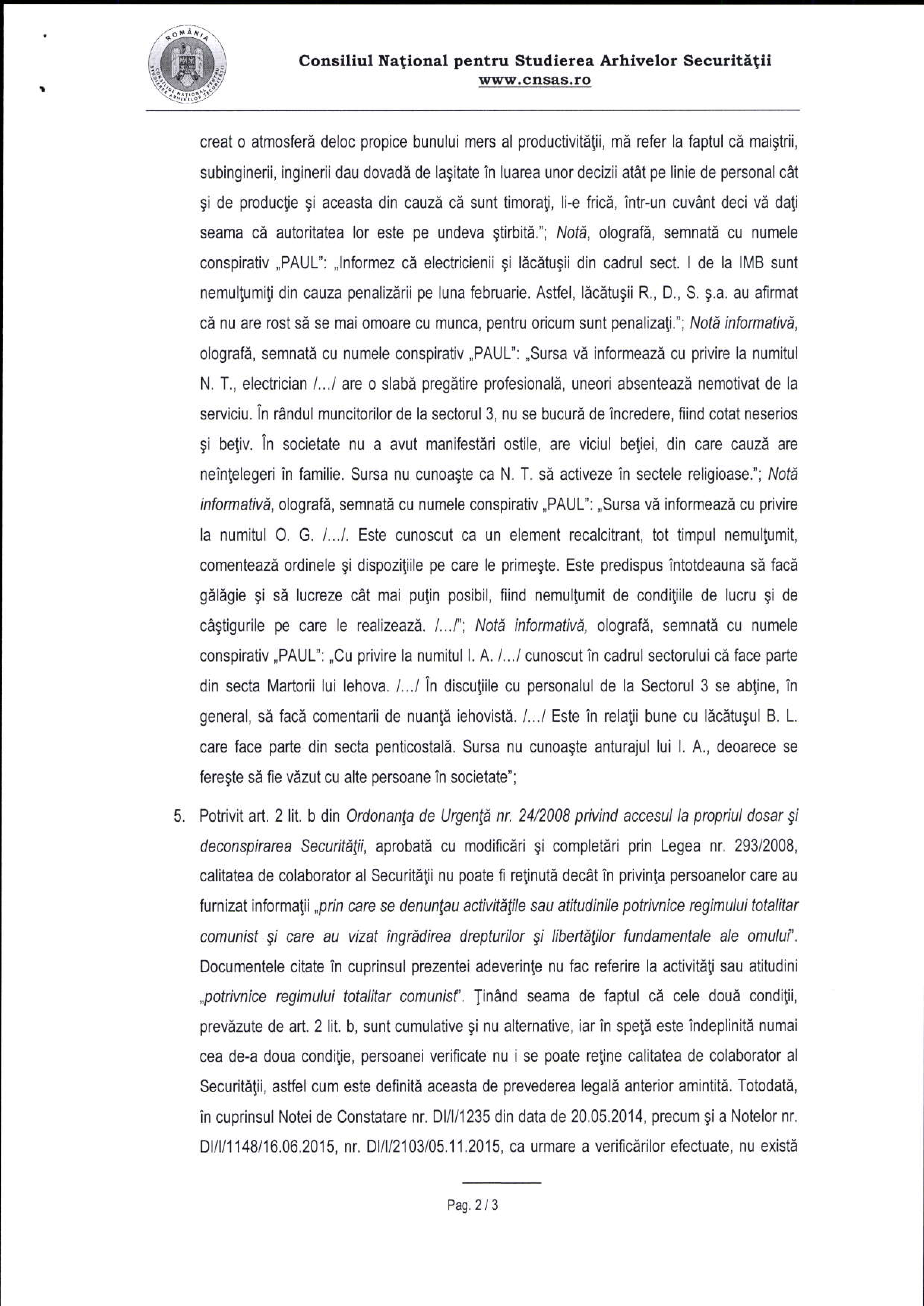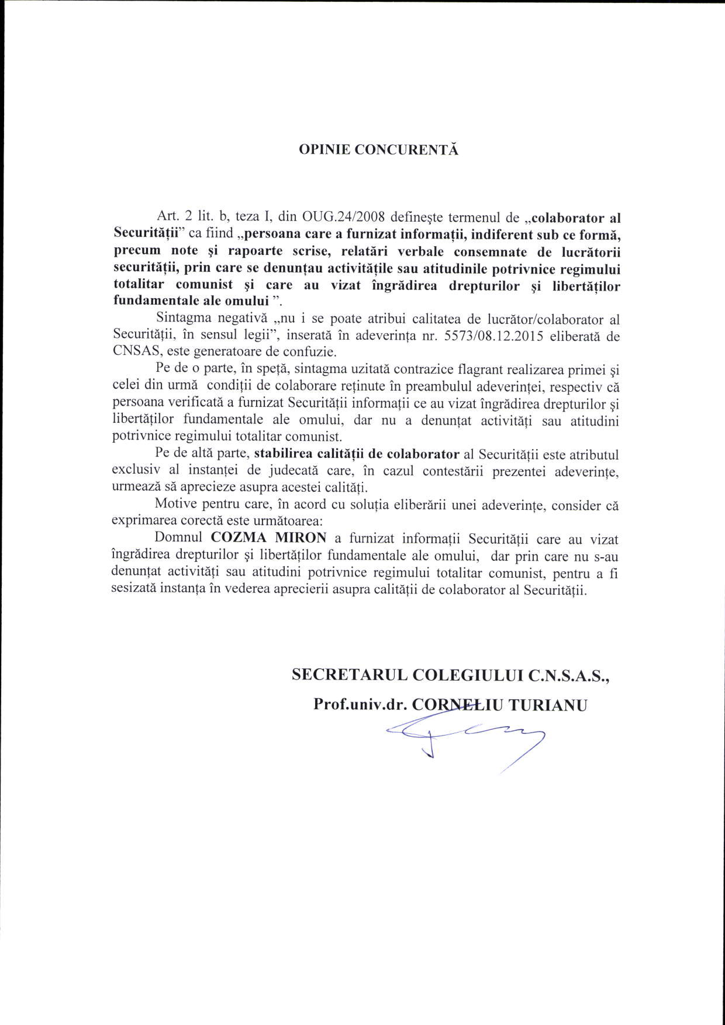 24/2008 privind accesul la propriul dosar şi deconspirarea Securitatii,(...) calitatea de colaborator al Securitatii nu poate fi retinuta decat in privinta persoanelor care au furnizat informatii "prin care se denuntau activitatile sau atitudinile potrivnice regimului totalitar comunist si care au vizat ingradirea drepturilor si libertatilor fundamentale ale omului".(...) "documentele citate in cuprinsul prezentei adeverinte nu fac referire la activitati sau atitudini potrivnice regimului totalitar comunist"(...) "Ca urmare a verificarilor efectuate, nu exista niciun fel de indicii cu privire la calitatea persoanei verificate de ofiter de Securitate, astfel incat nu poate fi retinuta nici calitatea de lucrator al Securitatii, potrivit art. 2, lit. a din Ordonanta de Urgenta nr 24/2008".Si cum unde-i lege nu-i tocmeala, concluzia Consiliului National pentru Studierea Arhivelor Securitatii bate orice document de aderare sau note olografe asezate ordonat in dosarul "Luceafarului huilei".