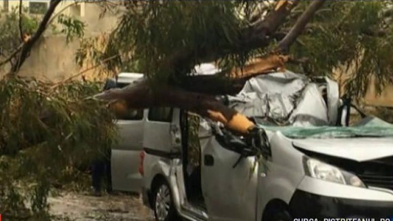 Sunt imagini suprinse la scurt timp dupa ce copacul imens, retezat de furtuna, s-a prabusit peste masina romanilor, chiar in dreptul lui Dan, care era la volan. Autoturismul s-a transformat brusc intr-un morman de fiare.