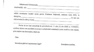 Elevii care vor să depună contestații trebuie să completeze și să semneze o cerere care conține și o declarație-tip, în care elevii menționează faptul că au luat la cunosțință că nota acordată în urma soluționării contestației poate fi mai mică sau mai mare decât nota acordată la prima corectură.