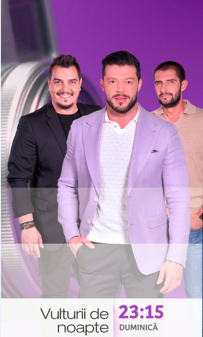 „Vulturii de noapte”, alcatuita din Victor Slav, Catalin Cazacu si Bursucu, ii astepta in continuare pe telespectatori in fiecare duminica, de la ora 23:15, cu doza uriasa de energie, atmosfera incendiara, cu glume bune si pofta de viata. Cei trei prezentatori fac echipa de zile mari, asa cum si-au obisnuit deja fanii, se completeaza reciproc si ii fac pe telespectatori sa traiasca intens si cu zambetul pe buze ultima noapte a weekend-ului.