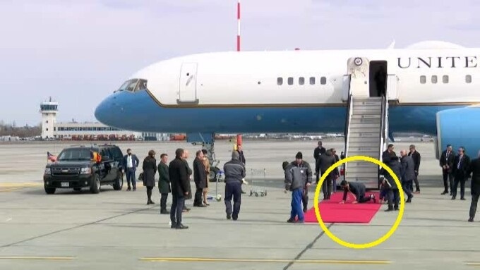 Conform protocolului, în locul unde aterizase deja avionul trebuia să fie adus un covor roșu, însă, pentru că, probabil, nu a fost găsit unul suficient de mare, angajații aeroportului au adus două covoare roșii, pe