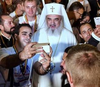 Mai multi participanti la festivitatea de deschidere a Întâlnirii tinerilor ortodocsi din toata lumea s-au fotografiat alaturi de patriarh, iar unul dintre ei chiar a avut îndrazneala sa faca un selfie cu Înaltpreasfintia Sa.
