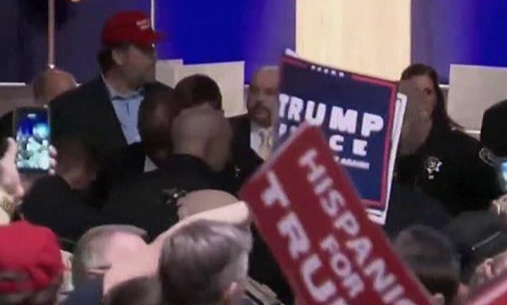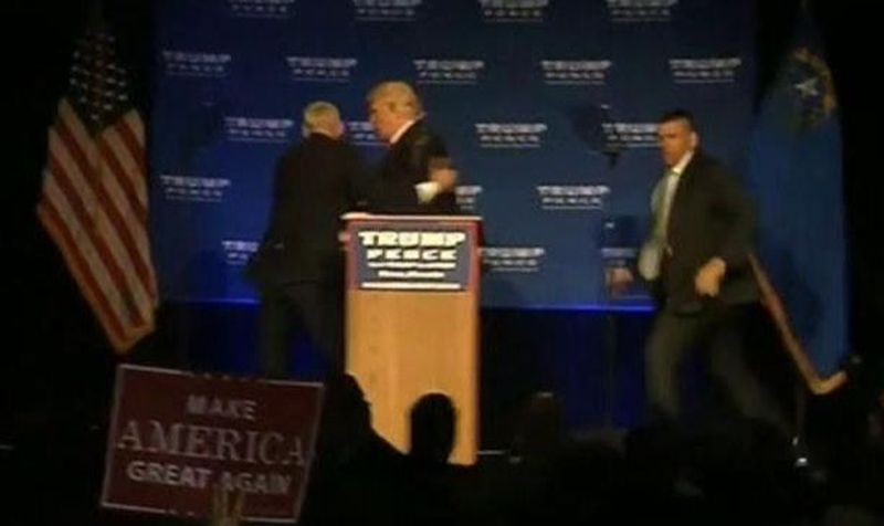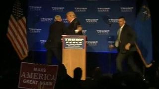 Donald Trump, candidatul republican la presedintia Statelor Unite ale Americii tocmai se afla in mijlocul unui discurs in fata alegatorilor din Reno, o localitate din Nevada. Cand din public s-a auzit ceva ciudat iar multimea a inceput sa se agite.Candidatul se opreste ,incearca sa vada ce se intampla insa din culise apar pe rand doi un bodyguardzi care il scot de pe scena. ##VIDEO32818##