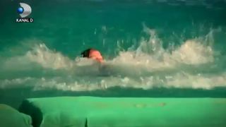 In promo difuzat de Kanal D pentru prima emisiune Exatlon sezon 2, care va fi miercuri, de la 19.30, Naomi apare intr-o secventa Aceasta este in apa, dupa ce a aterizat de pe un tobogan si pare ca are probleme sa ajunga la marginea bazinului.