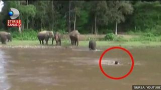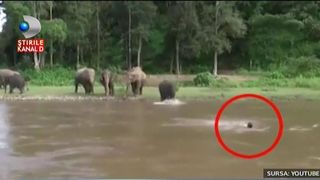 Oare pe animal l-au deranjat tipetele barbatului sau pur si simplu este curios sa vada ce pluteste prin apa? Elefantul se apropie si pentru cateva fractiuni de secunde, pare sa reprezinte o noua amenintare pentru bietul om aflat si asa in pericol.