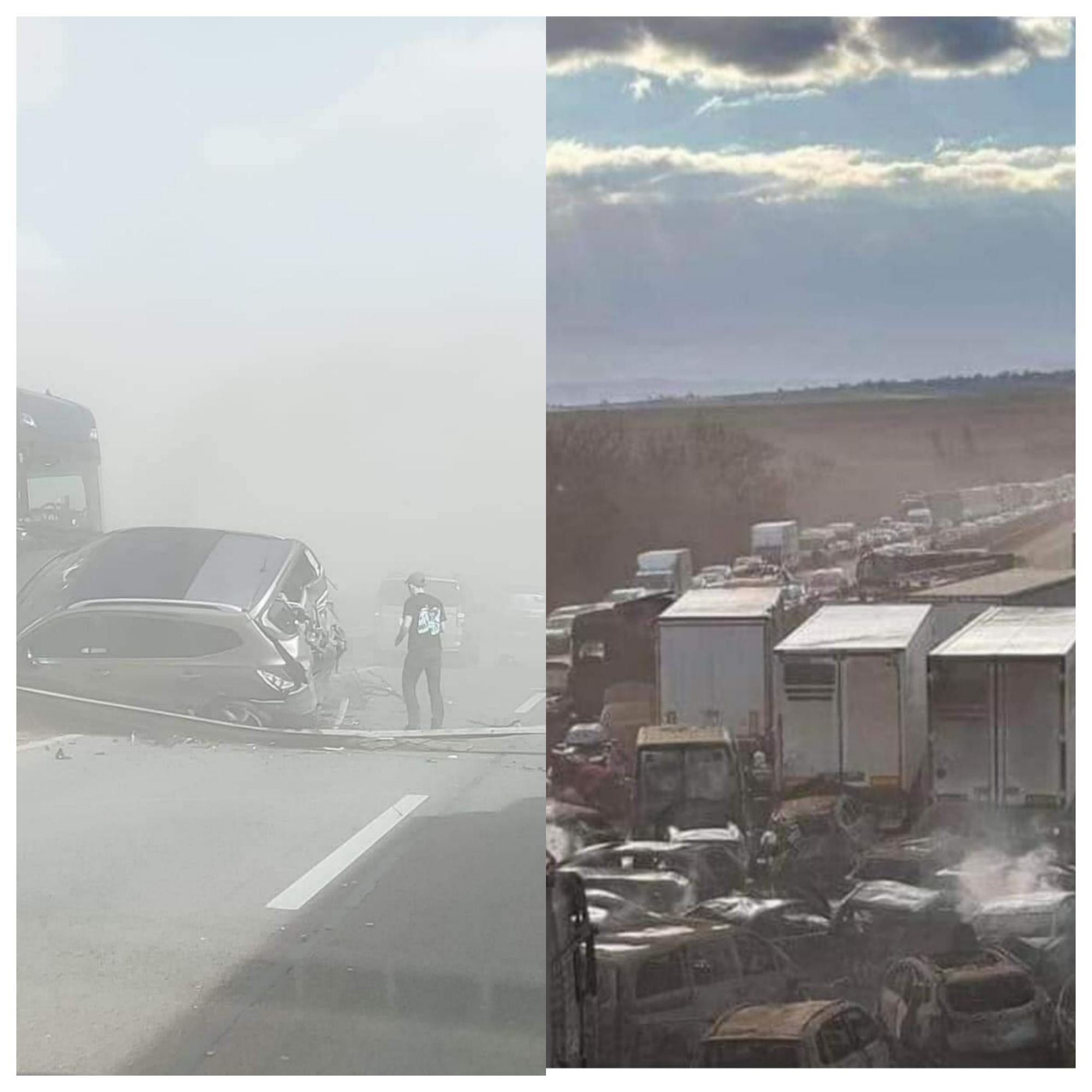 O persoană a murit, iar alte 39 au fost rănite, după ce 5 camioane și 37 de mașini s-au ciocnit în lanț. Printre victimele acestui tragic accident se află și trei români. Acesta ar fi fost provocat de o furtună de praf care a scăzut vizibilitatea, iar carambolul a fost urmat de un incendiu uriaș, iar mai multe mașini s-au făcut scrum. Un camion ar fi deviat de pe sensul său de mers și ar fi intrat pe sens opus ciocnindu-se violent de alte mașini.