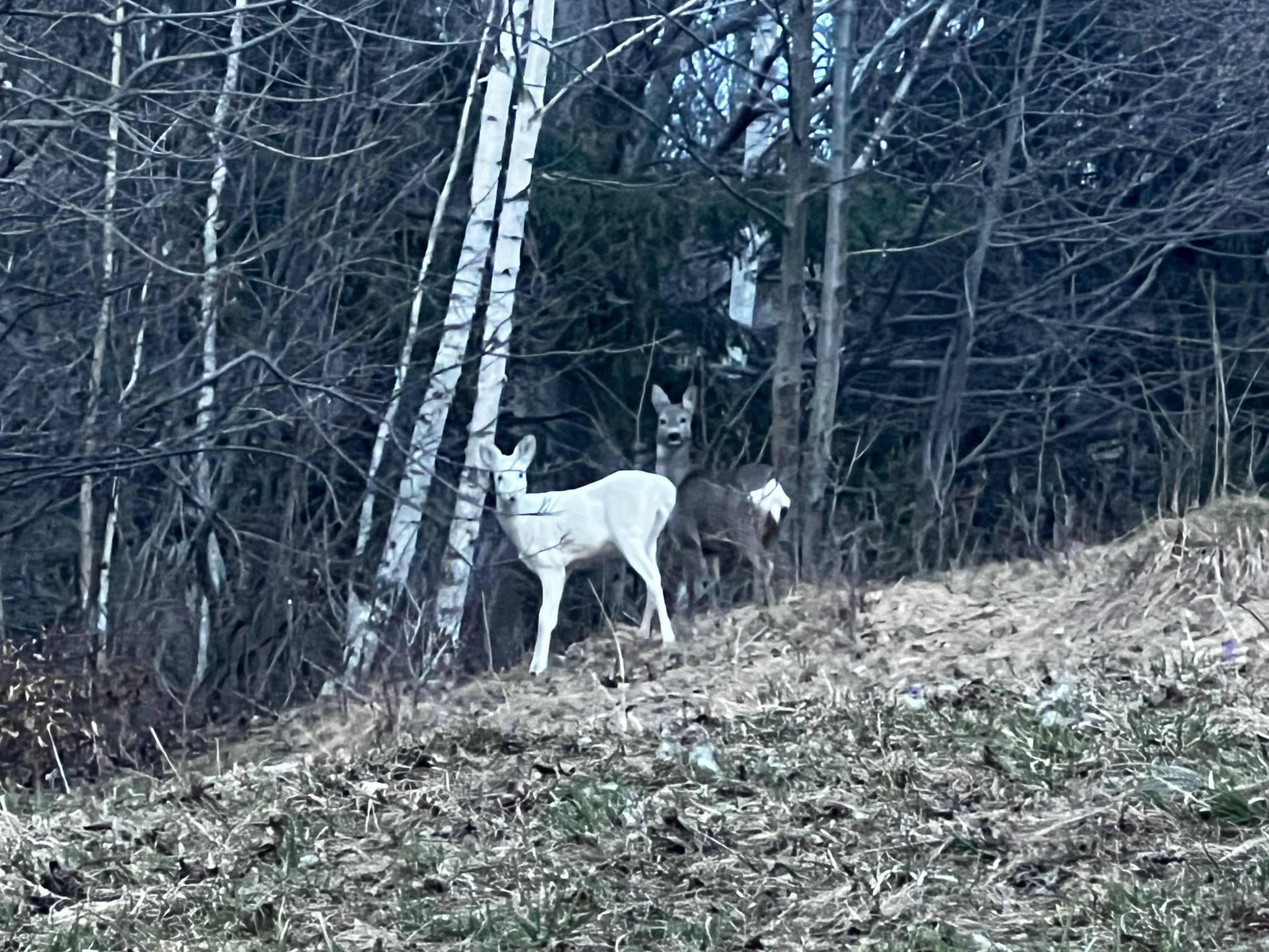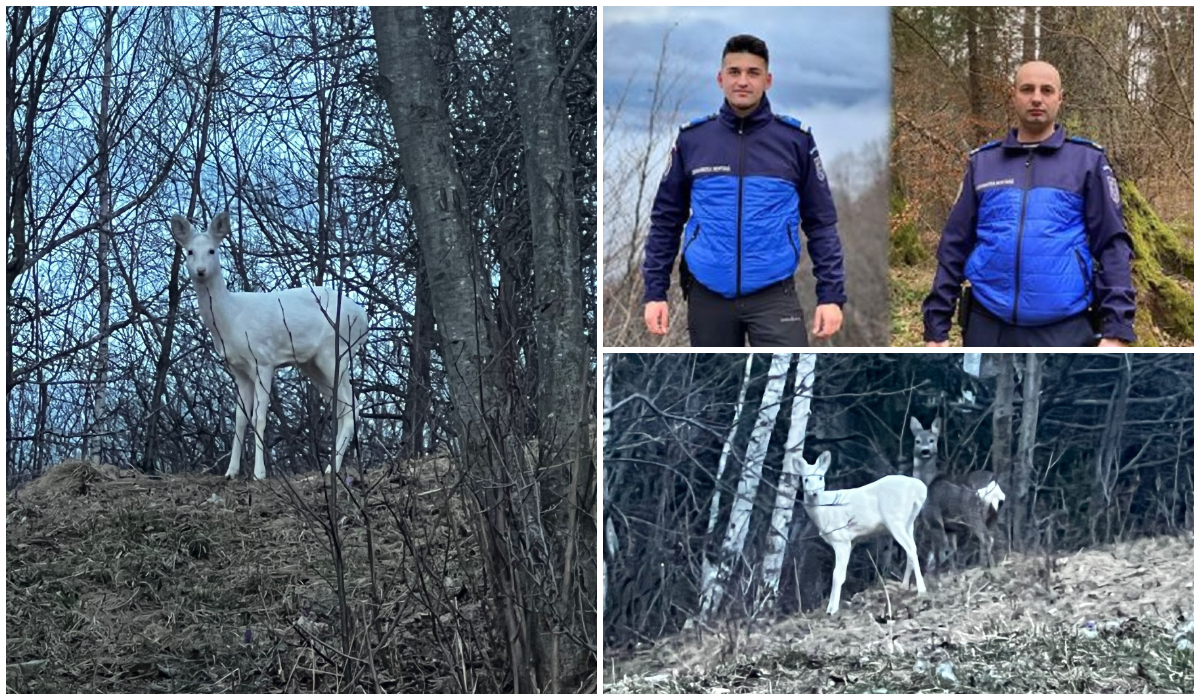Căprioara albă ca zăpada a fost surprinsă de jandarmii montani pe un traseu din zona stațiunii Bran. Fotografiile emoționante au devenit virale pe rețelele sociale.