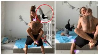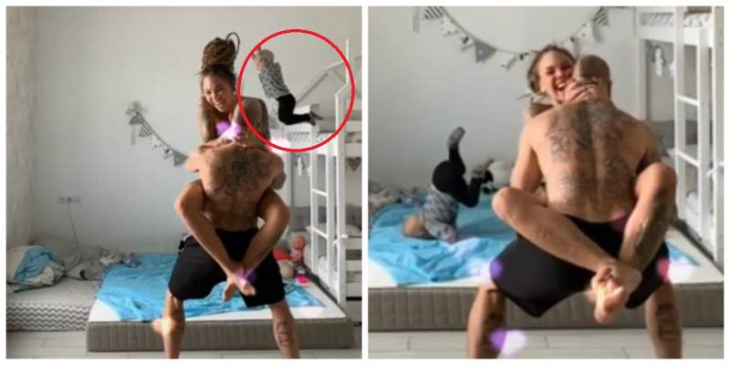 În videoclipul făcut public pe rețelele de socializare se poate vedea cum copilul de doar trei ani încearcă să o copieze pe mama lui, Sveta Ananas, care sare în brațele soțului ei, Andrei.
