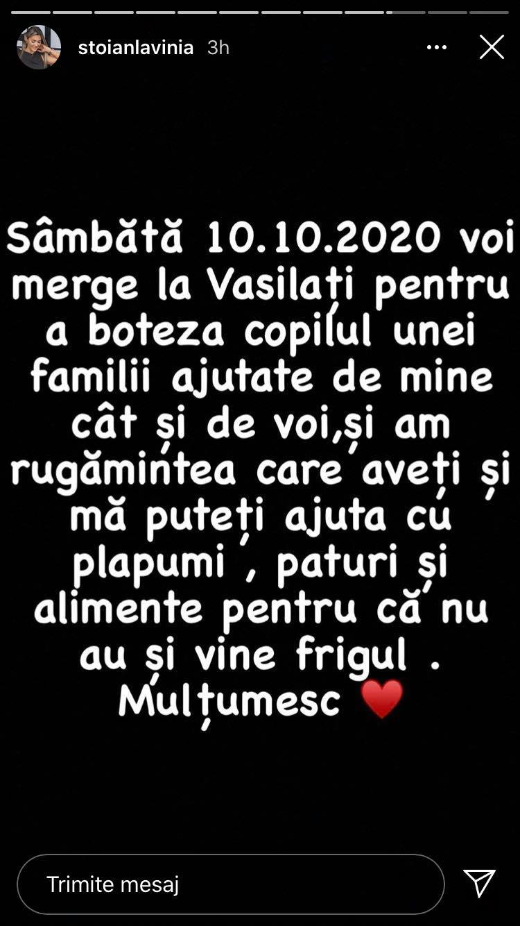 „Sâmbătă, 10.10.2020 voi merge la Vasilați pentru a boteza copilul unei familii ajutate de mine cât și de voi, și am rugămintea care aveți și mă puteți ajuta cu plapumi, pături și alimente pentru că nu au și vine frigul. Mulțumesc.” le-a transmis Mona de la „ Puterea Dragostei ” urmăritorilor de pe Instagram.