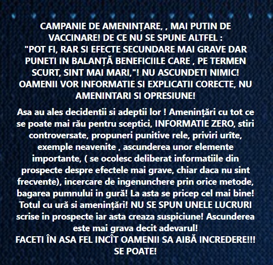 "Amenințări cu tot ce se poate mai rău pentru sceptici, informaţie zero, ştiri controversate, propuneri punitive rele, priviri urâte, exemple neavenite, ascunderea unor elemente importante (se ocolesc deliberat informaţiile din prospecte despre efectele mai grave, chiar dacă nu sunt frecvente), încercare de îngenunchere prin orice metode, băgarea pumnului în gură! La asta se pricep cel mai bine! Totul cu ură şi amenințări! Nu se spun unele lucruri scrise în prospecte, iar asta creează suspiciune! Ascunderea