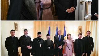 Preoţii au îmbrăcat ţinutele lor obişnuite, negre, în contrast evident cu rochia cu volane de culoare roz pal a lui Carmen Iohannis, acoperită cu un voal transparent cu buline negre, pe care a accesorizat-o cu