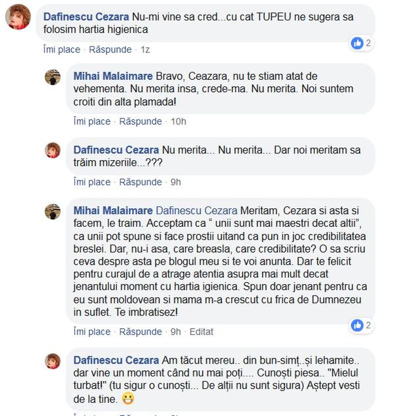 ”Nu-mi vine să cred. Cu cât tupeu ne sugera să folosim hârtia igienică”, a scris Cezara Dafinescu pe contul ei de Facebook. Actrița face referire directă la gestul lui Rebengiuc din timpul Revoluției din 1989, când acesta a venit la TVR cu un sul de hârtie igienică și l-a oferit simbolic unor colegi de breaslă care ”l-au cântat” pe