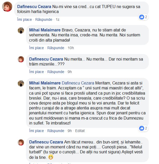 Acceptăm că ”unii sunt mai maeștri decât alții”, că unii pot spune și face prostii uitând că pun în joc credibilitatea breslei. Dar, nu-i așa, care breaslă, care credibilitate? O să scriu ceva despre asta pe blogul meu și te voi anunța. Dar te felicit pentru curajul de a atrage atențoa asupra mai mult decât jenantului mpment cu hârtia igienică. Spun doar jenant pentru că eu sunt moldovean și mama m-a crescut cu frica de Dumnezeu în suflet.