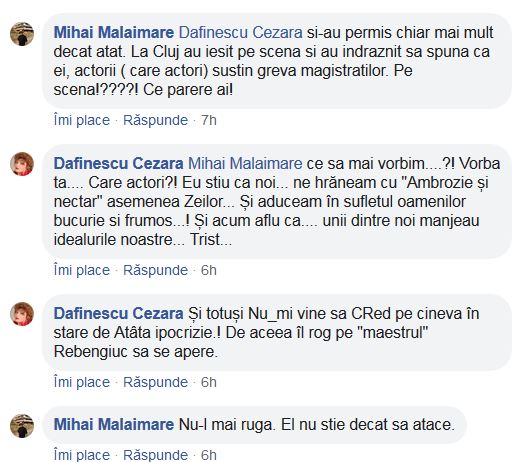 ”Și totuși nu pot să cred pe cineva în stare de atâta ipocrizie! De aceea îl rog pe ”maestrul” Rebengiuc să se apere”, a concluzionat Cezara Dafinescu, folosind ghilimele la ”maestru” din motive lesne de înțeles.