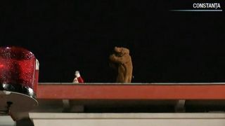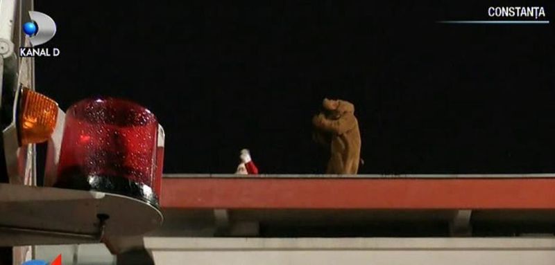 Salvatorii au fost anuntati ca un barbat imbracat in rosu, ajuns pe o cladire inalta, striga dupa ajutor de doua ore, iar alaturi de el s-ar afla un animal mare, cu coarne.