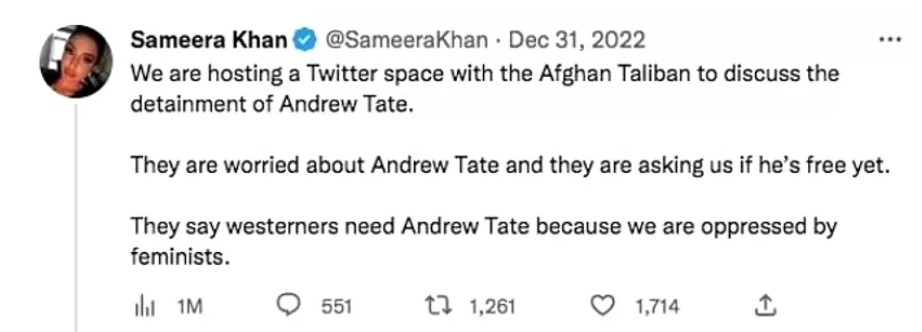 În octombrie 2022, acesta a anunțat public că s-a convertit la islam.La puțin timp după ce frații Tate au fost arestați pentru trafic de persoane și viol, Sameera Khan, o fostă participantă la concursurile de frumusețe din SUA care face parte din anturajul milionarilor, a postat un mesaj pe Twitter în care a spus că talibanii din Afganistan sunt îngrijorați pentru Andrew Tate.
