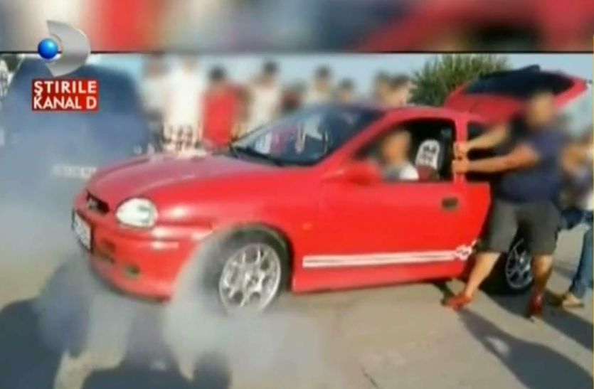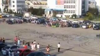 Imaginile sunt suprinse in ceea ce pare o parcare, la marginea orasului Galati. 300 de masini s-ar fi adunat pentru acest spectacol. Bineinteles, privitorii n-au lipsit.