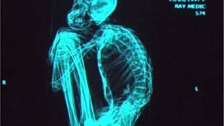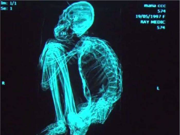 Folosind scanarea tomografica, putem vedea scheletul mumiei. tesutul este de natura biologica si compozitia sa chimica indica faptul ca ar fi vorba de un om.