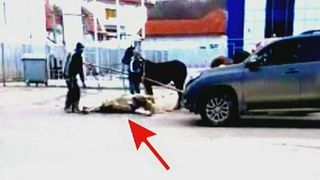 Sunt imagini filmate in plina strada, care ar cutremura pe oricine. Priviti cum un individ isi taraste pe bulevard unul dintre cai- in zadar, insa. Animalul este extenuat si se prabuseste la pamant.