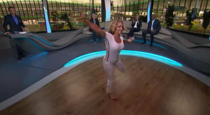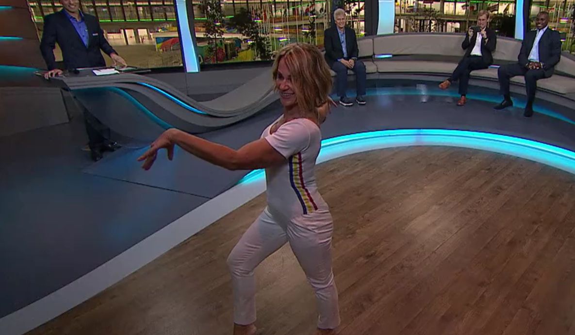 Nadia Comaneci a facut spectacol intr-un studio de televiziune. Fosta gimnasta a fost provocata de fostul inotator Marc Spitz sa repete exercitiul la sol pe care l-a facut la Montreal, in 1976.