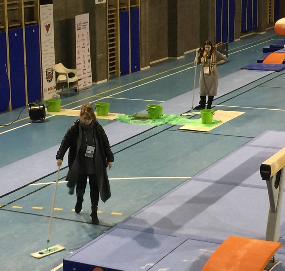 In sala din Cluj-Napoca in care se antreneaza sportivii inainte de a concura a ploat in cursul zilei de joi, iar cei implicati au fost obligati nevoiti sa dea cu mopul, indiferent de numele sau statutul pe care il au.