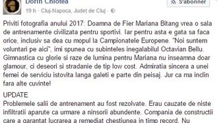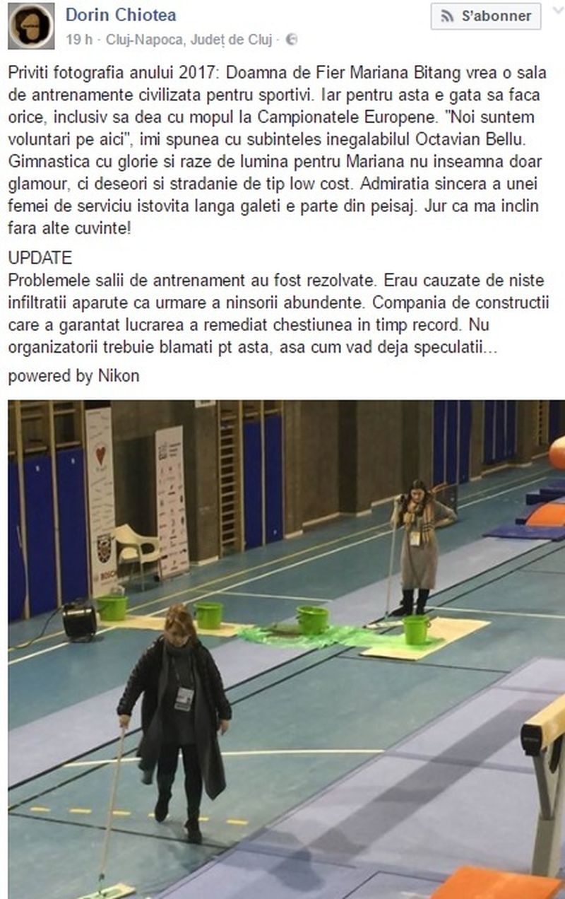 Jurnalistul Dorin Chiotea a publicat pe pagina personala de Facebook o imagine in care Mariana Bitang, una dintre cele mai mari antrenoare din istoria gimnasticii romanesti, dadea cu mopul pentru a indeparta apa.