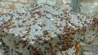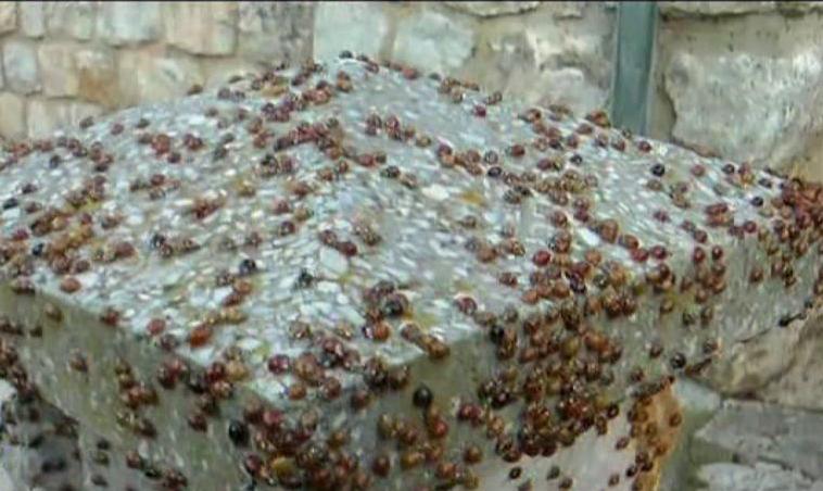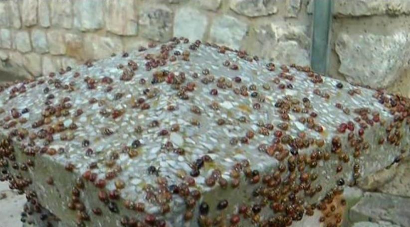 Toata fadata bisericii este tapetata cu buburuze. Mii de insecte s-au strans ca albinele la miere si au invadat manstirea.
