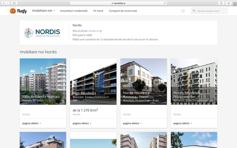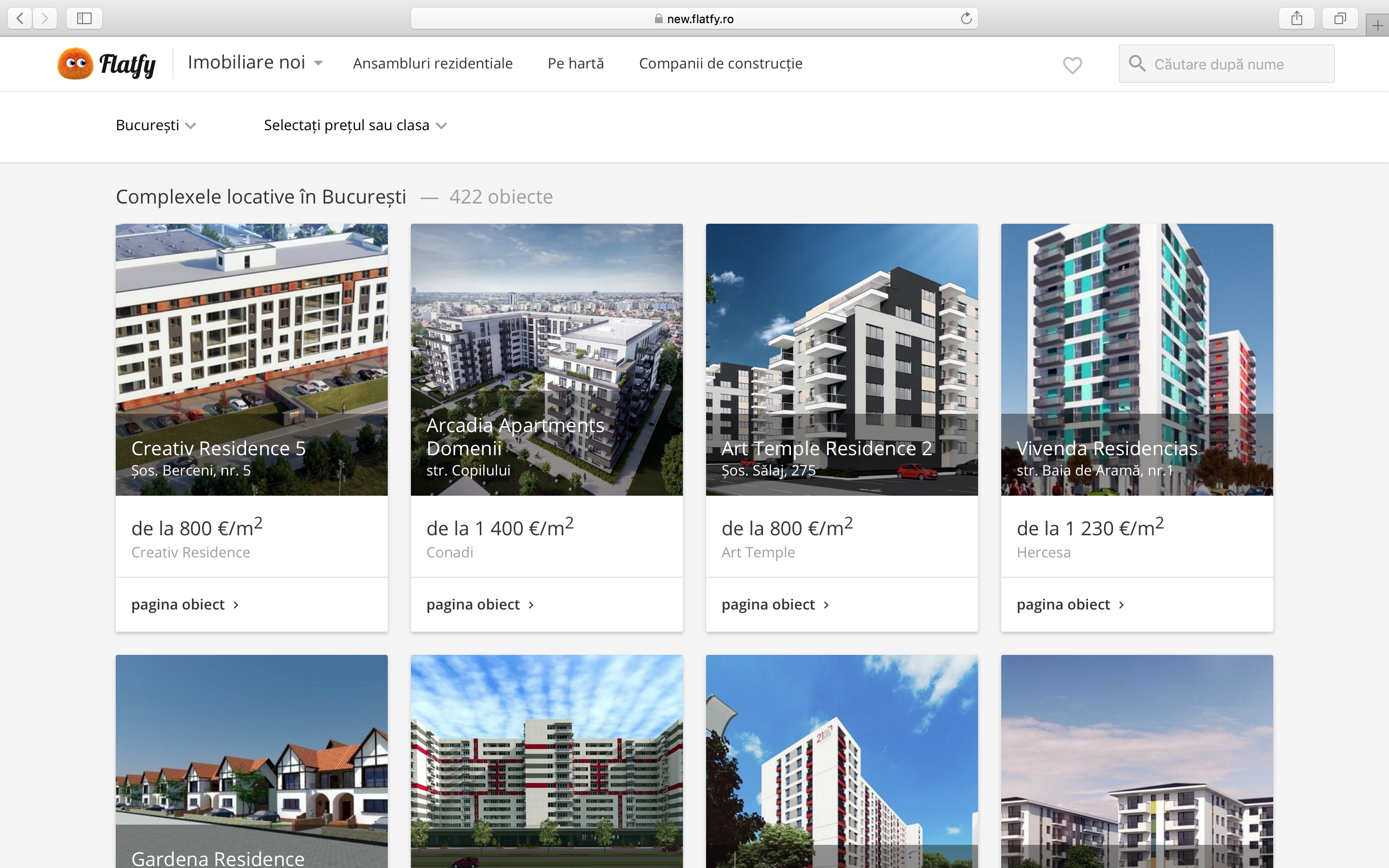 Motorul de căutare Flatfy a lansat un catalog unic cu imobiliare noi din România. Chiar acum există posibilitatea de a vedea propoziţii în 670 de Ansambluri Rezidenţiale şi case din Bucureşti, precum şi din alte regiuni a ţării, care se construiesc sau deja sunt finisate de la 399 de Dezvoltatori.