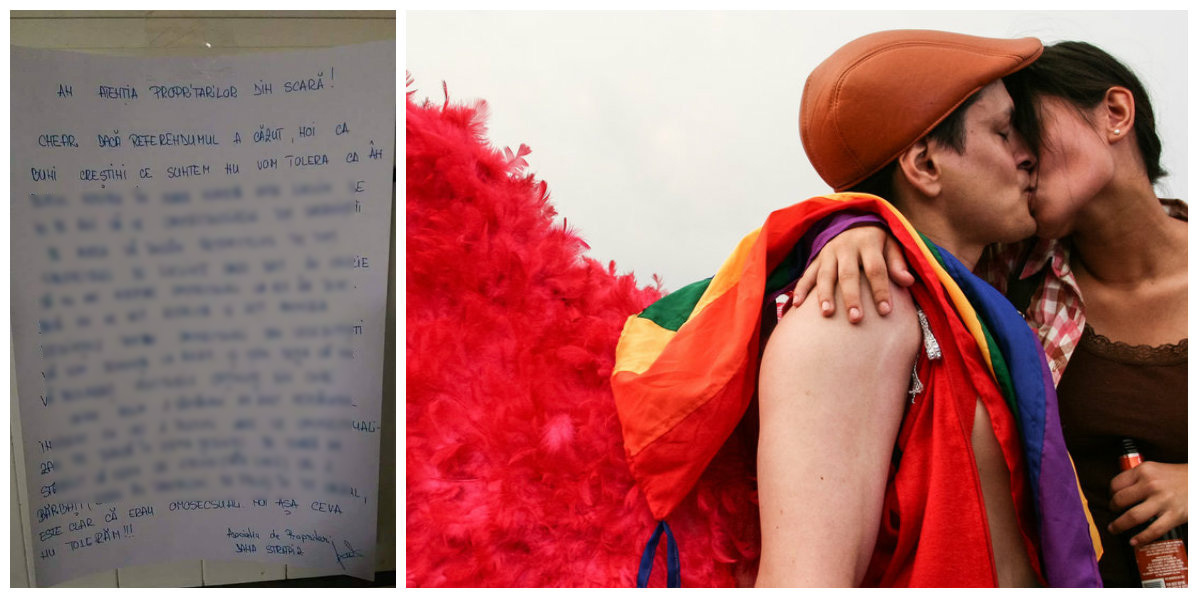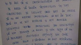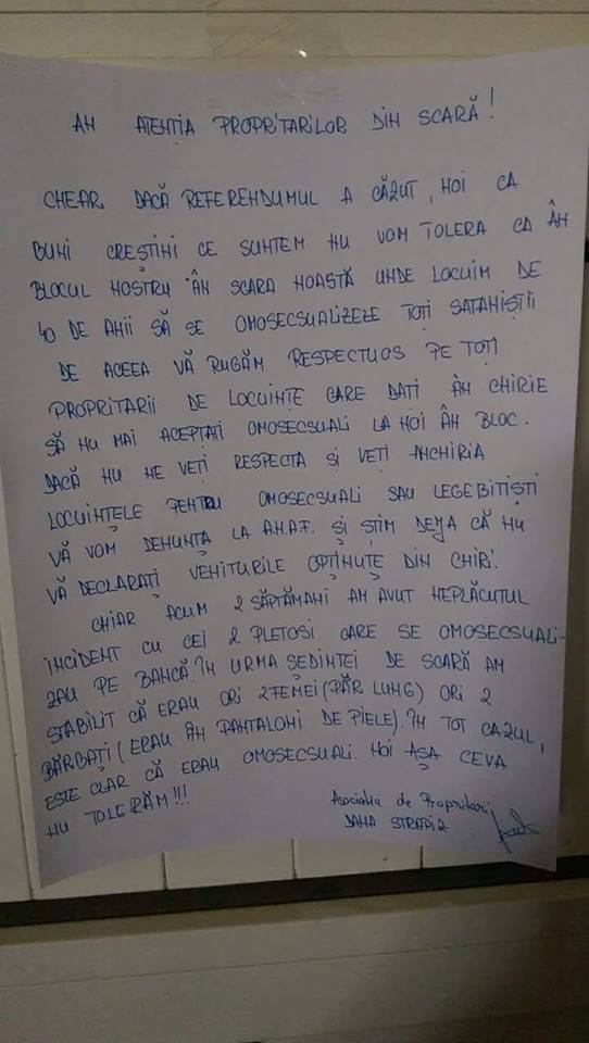 1 din 2 | "Noi pe 'omosexuali' nu îi tolerăm!" - Mesajul postat într-o scară de bloc care i-a făcut pe internauţi să leşine de râs! Ce s-a postat la avizier imediat după Referendum