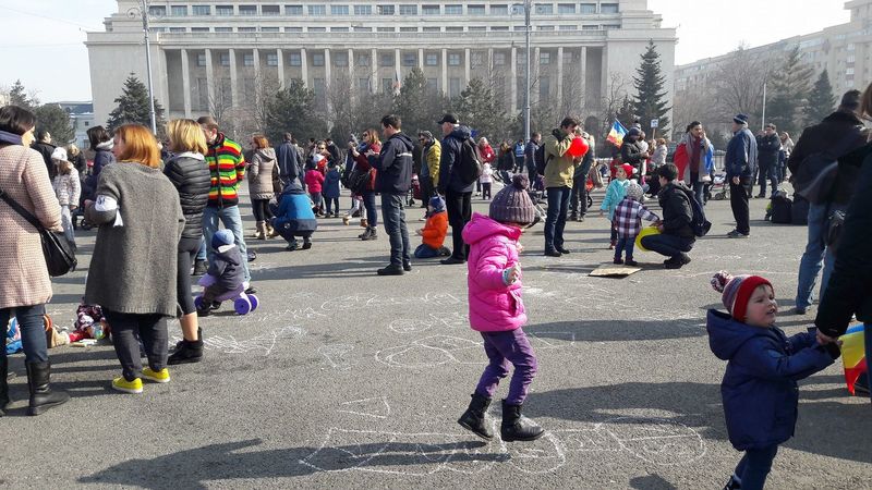 UPDATE 12.38: Aproximativ 300 de parinti si copii s-au strans, sambata dupa-amiaza, in fata Guvernului. Protestul este unul pasnic, copii s-au apucat sa deseneze pe asfalt, ca si la evenimentul similar din urma cu doua saptamani.