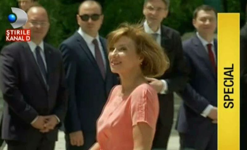 Dar, mici scapari tot mai apar. Azi, inainte de sosirea presedintelui Germaniei la Palat, prima doamna a avut parte de un mic incident. Cand a ajuns pe platoul Marinescu, prima doamna avea ochelari de soare. Si-a dat seama ca nu isi poate primi musafirii cu ei la ochi si a incercat sa ii ascunda in micuta poseta.