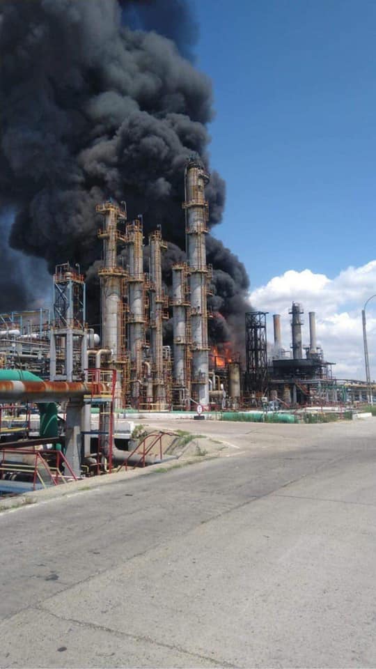 Imaginile de la fața locului surprind norul negru pe care incendiul de la rafinărie continuă să-l emită: