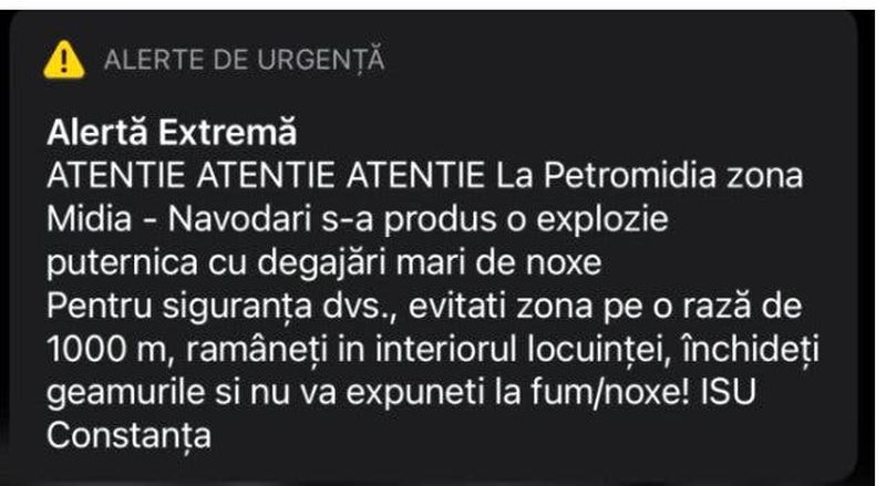 1 din 4 | Nor toxic după explozia de la Petromidia. Ce spune mesajul Ro-Alert pentru avertizarea populației
