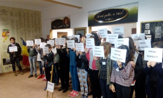 Copiii, împreună cu părinţii lor, au protestat în holul de la intrarea în instituţia de învăţământ. Ei au purtat pancarte prin care cereau să fie lăsaţi să înveţe, iar colegul lor cu probleme de sănătate să fie transferat la o altă şcoală.