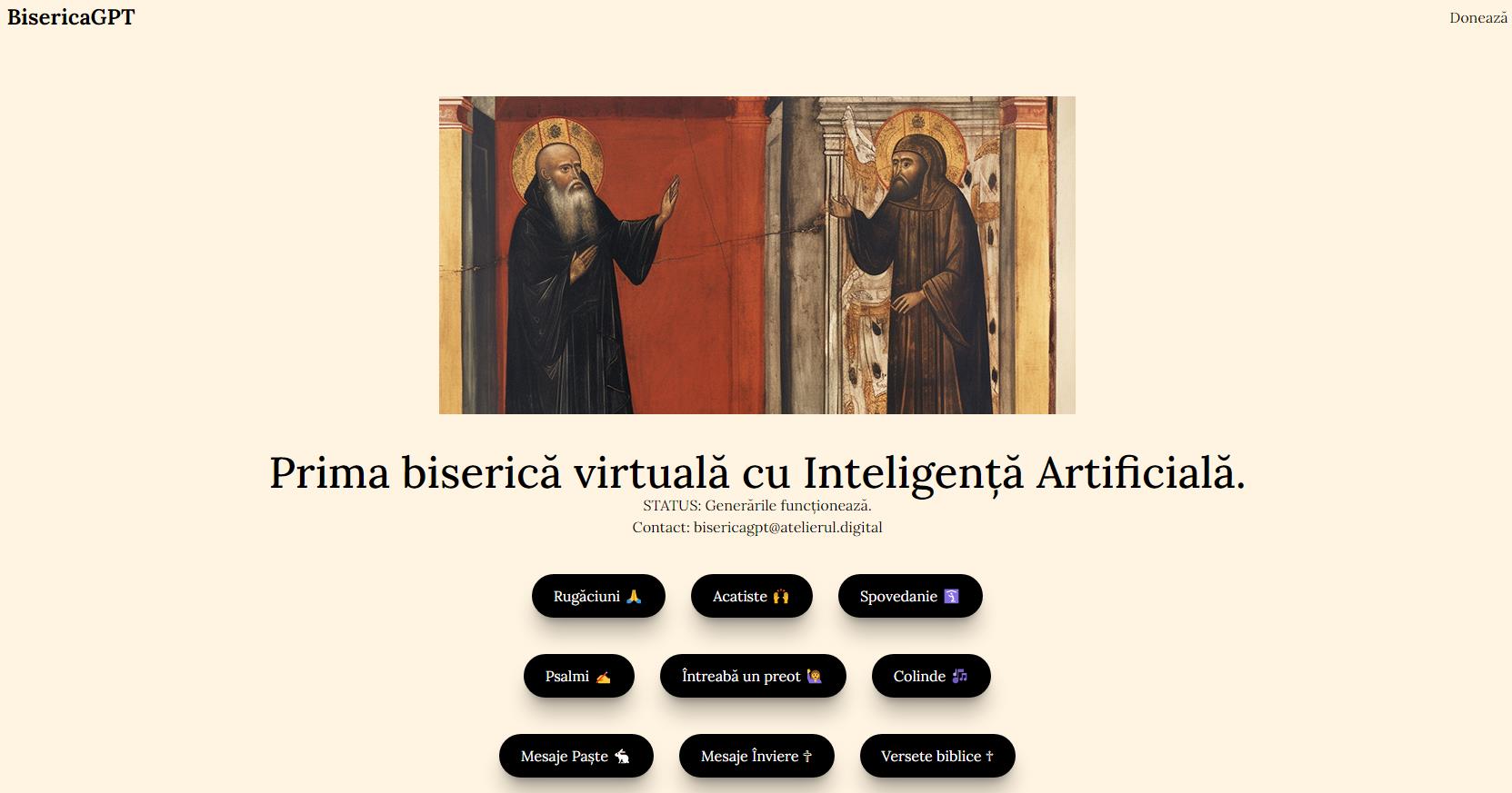 BisericaGPT este prima biserică virtuală din România, bazată pe Inteligența Artificială. Pe site-ul bisericii, oamenii se pot ruga, spovedi, da acatiste și pot vorbi cu preoții virtuali.