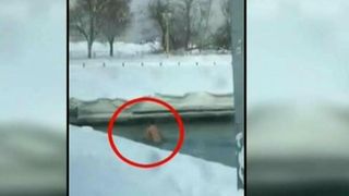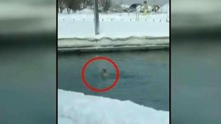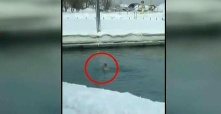 Dupa cateva secunde, curajosul se indreapta, sprinten, catre iesire.... nu de alta, dar ar putea ingheta, la propriu: afara sunt -12 grade celsius, iar in apa...