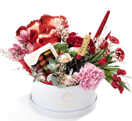 Pentru o seara romantica si reusita, iti prezentam Cutia Gigant Cu Lalele Rosii, Hortensii, Trandafiri, Cymbidium, 2 Lumanari Parfumate, Cutie Cu 12 Macarons Si Moet & Chandon Brut Imperial.