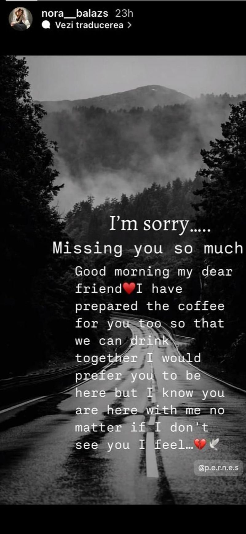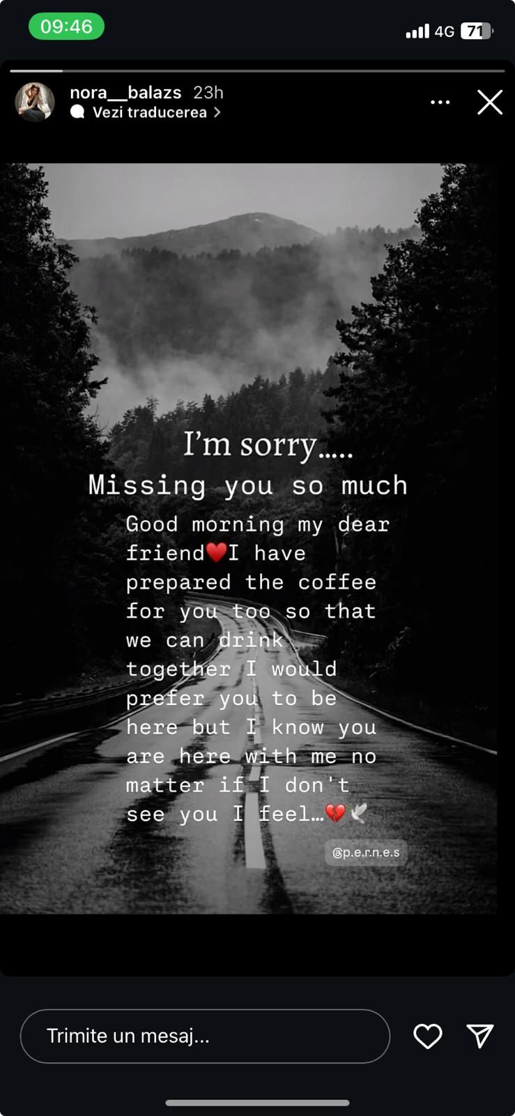 Îmi pare rău... Îmi lipsești atât de mult, a scris Nora pe Instagram.