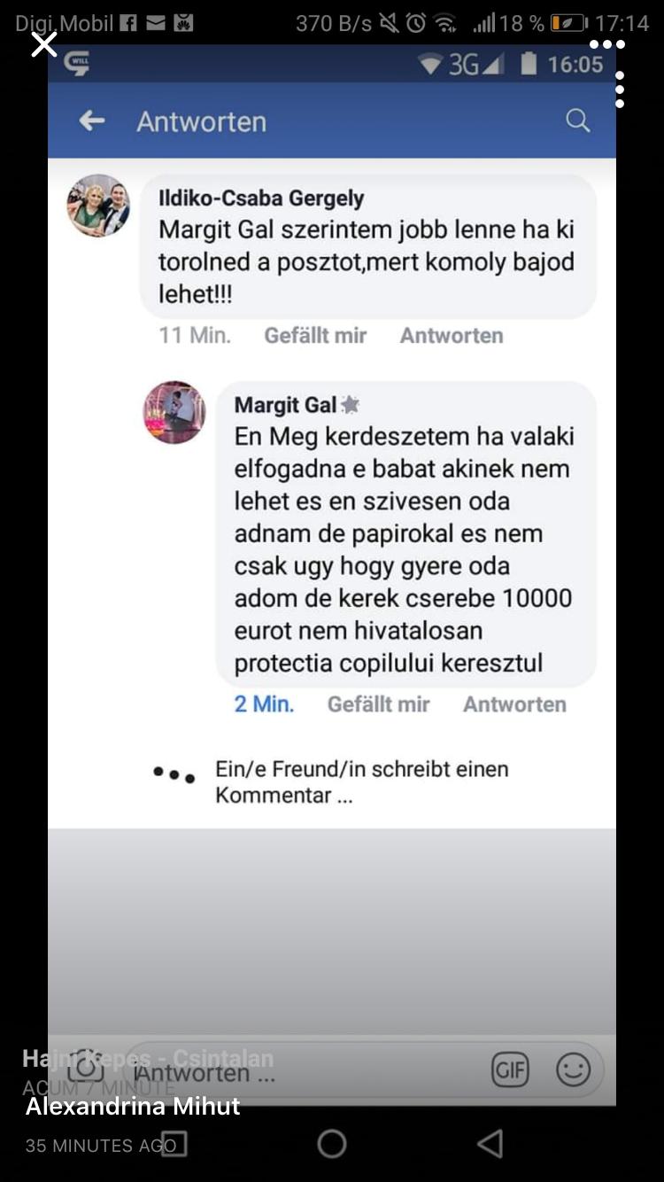 "Eu am întrebat dacă cineva ia copilul, cineva care nu poate avea copii, eu îl dau cu plăcere dar cu hârtii, nu numai așa hai ca ti-l dau. Dar cer în schimb 10000 de E. Nu legal prin Protecția copilului", asa se traduce ultimul mesaj scris de ea în maghiara, răspunsul pe care ea i l-a oferit unei femei care a vrut să ia copilul.