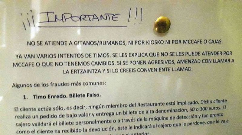 O nota care ar fi fost postata in vestiarul unui restaurant fast-food din Spania cere angajatilor sa nu serveasca romani sau tigani, potrivit unei fotografii publicate pe cel mai mare forum din Spania, Forocoches, arata un articol postat pe site-ul postului spaniol de radio vozpopuli.