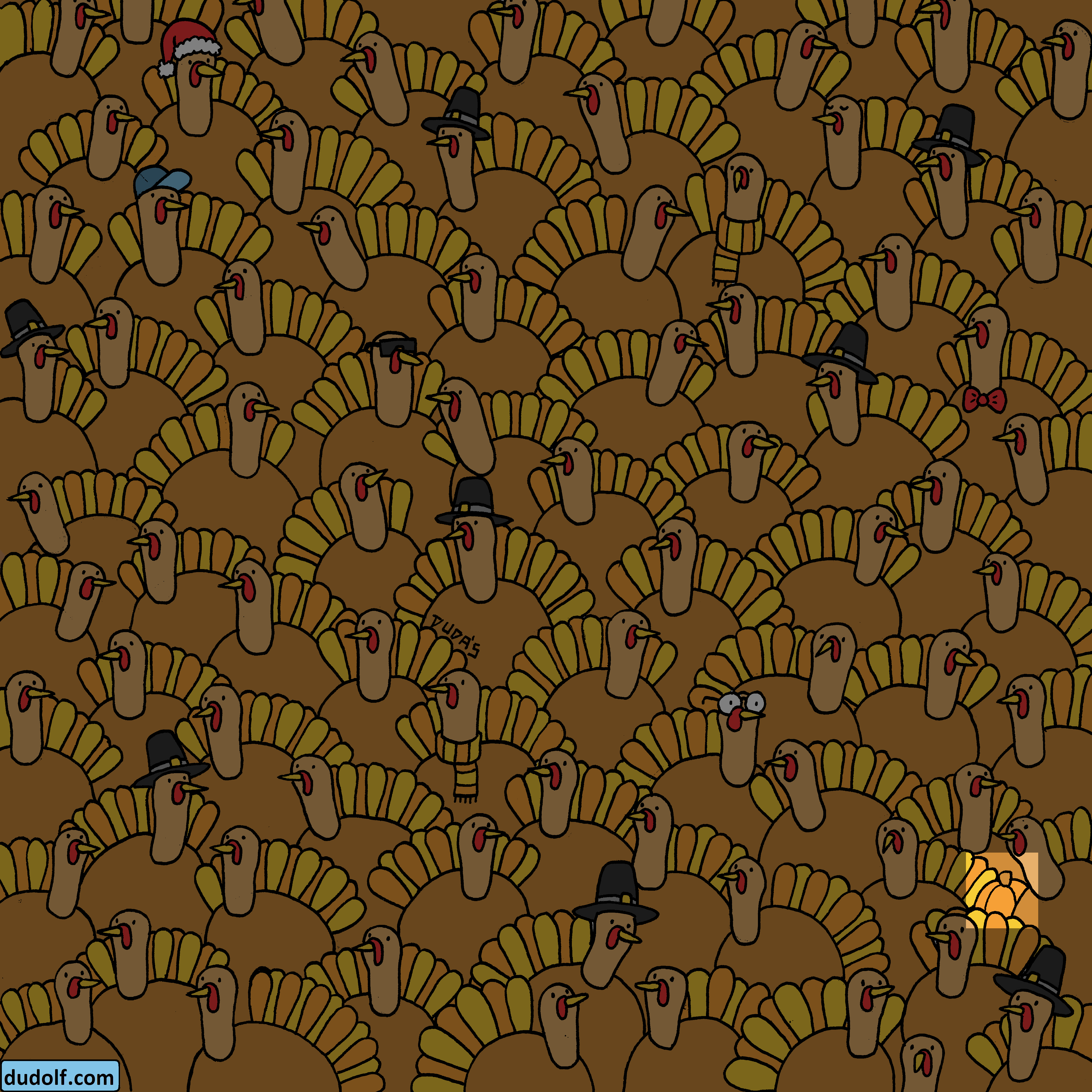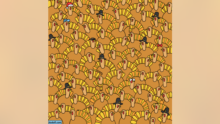 Test IQ bazat pe o iluzie optică. Testează-ți abilitățile de a rezolva un puzzle realizat în onoarea Zilei Recunoștinței, sărbătorită de americani pe finalul lunii noiembrie. Exercițiul de inteligență îți cere să găsești cât de repede poți dovleacul ascuns într-o mulțime de curcani.
